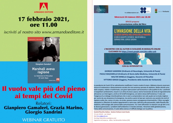 Vi invio i link di due web seminar che penso possano interessare i nostri iscritti della Borsieri e che prendono spunto dalla presentazione di due libri. Il primo, programmato per mercoledì 17 alle 11.00 riguarda il ruolo dei nuovi strumenti di comunicazione, i cui pregi e difetti sono emersi in particolare durante la pandemia, evidenziando quanto fossero giuste le analisi fatte da un grande studioso della comunicazione, Mac Luhan, molti decenni orsono, il secondo programmato per mercoledì 24 alle 18.30, partendo da un'analisi dell'origine della pandemia (devastazione ambientale,sovraffollamento,etc) considera i profondi effetti prodotti sulla nostra vita, contribuendo ad evidenziare rilevanti problematiche della nostra società prima trascurate. Allego le due locandine.